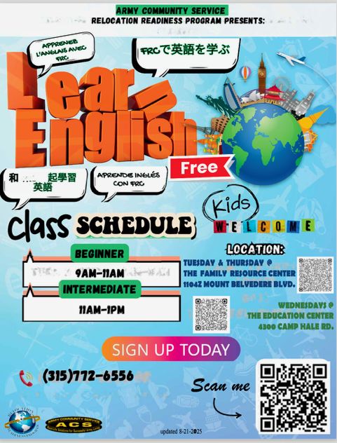 Did you know that English classes at Fort Drum are now offered three days a week? These fun and friendly ESL classes are open to soldiers and their family members who want to feel more comfortable using English. The beginner class meets from 9:00 to 11:00, and the intermediate class meets from 11:00 to 1:00 on Tuesdays, Wednesday, and Thursdays. Students spend time reading, writing, speaking, and listening in English. Class members often work in pairs or small groups to practice real conversations and build confidence using English in everyday life. Many students enjoy the chance to make new friends, meet people from different places, and play games that make learning English both enjoyable and useful.