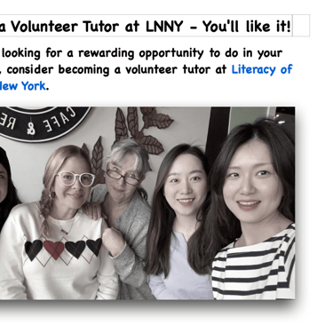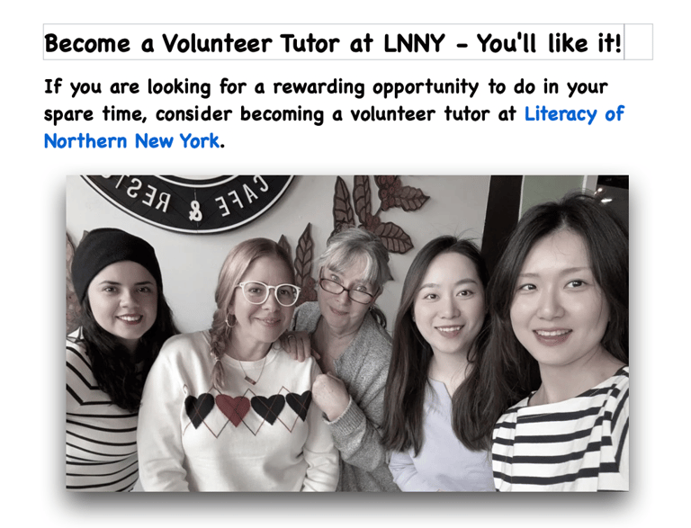 Join our team at Literacy of Northern New York and become a volunteer tutor. You will help an adult improve reading, math or English language skills. The training is online - You meet in person with our staff for a Pre-session, then complete your chosen module. You then meet again for a final Post-session. The training can be done on your schedule. After completion, you are matched with a student and we provide the materials. You meet in public places for tutoring sessions. There is no cost! You can register and take the training anytime.